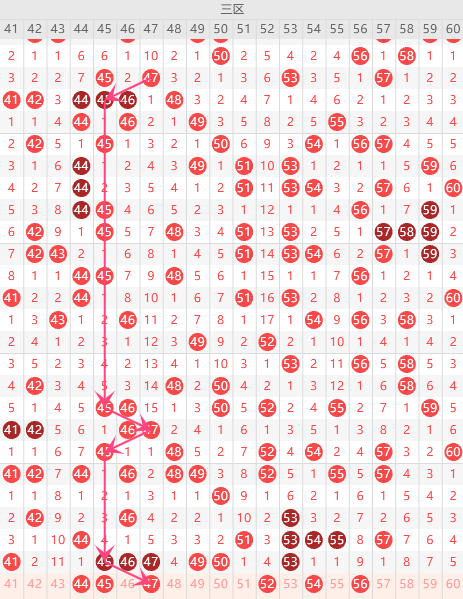 第三区间的走势分析:第三区间上期开出了7个号码球,属于前半区6个,后半区1个码。走出了5奇1偶的形态走势,根据三区间的走势规律,今天的三区间我们主看前半区位置45组合的落位,根据45的落球规律,重点关注45、54组合这个号码球的落位。