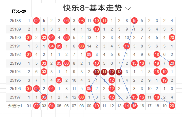 上期开奖数据解析,区间比6545,重码4,5期以下开出不含重码14,冷码开出1,9期以上.尾数集中5尾,其他尾比例平均,奇偶比的区间很稳定.5期以下加重码达18个数,重点选码在5期以下,选码方式做出调整.以区间比,重码,尾数比,走势图为主要条件选码,先做出粗选,在总结.以此为据,推测198.