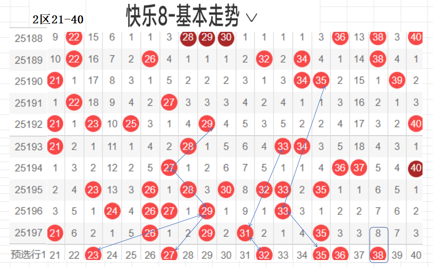 二区(21-40):遗漏5期以下有16,021 26 29 31 35  5,数据所示,冷码平均,选择条件增多了.上期开出了5个号码,出码比较分散.这期布防相应增加,重码按比例落这区较少,先给出重码21,这个区间间接走势,温区,21-30区间上期开了3个,依旧不是重点选号区间,31-40区间开出2个,本期关注热码的回补,间隔小遗漏值最佳,3字头转热,这个小区热码注意回调,可以做关联码的布局,注重温冷码的回补.