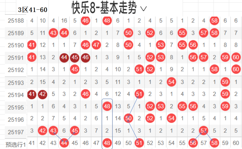 三区(41-60):遗漏5期以下有18,042 43 45 57  4,温开方式,这区码数有回暖之意,可以防一手,先定胆码走势较大者,隔期,斜三连,分边号码,可重防,间隔5以上号码可以随走势选取,例如本期大冷码,走势比较大,可以做胆,通常联动可带出,分边对称的号码,本区间也有很大走势.可关注下.隐形夹角号码.做补位形态号码.都需要观察动态走势.以上是本区间的选码方法.
