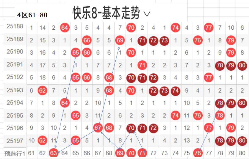 四区:(61-80):遗漏5(5)以下有16,062 65 78 79 80  5,平均温开方式,上期开出5,区间回暖,后区可防,本区间从以往数据来看,重码很强,一枝独秀的存在,可以连下多期,区间回暖,本区间后区可防,与一区相比,也是温区.,对称下落,隔期回补码,可以防,这区对呈对称三角关系的胆码,斜三连有走势的胆码,联动落位码,都有各自的走向落位关系,根据走势选择一种方式选码.