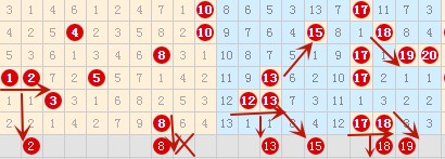 上图中1-10号数字近两期内都只开出了一个号码,本区域太冷,本期有点难下手。在上图中我们看到有1 2这两个连号已经同时有2期没落号了,本期应该是要落一个号的。回顾历史期数中,1 2连号空几期落号大多数都是落2号数字,所以这里比较看好的。8号数字近期内出号大多都是以重叠号出现,所以这里不得不防一手。11-20号数字这个小区间有走热趋势,可以多下手几个号,回顾历史期数中,13号数字出现重叠好之后,都是空一期就出号了,这里必须要认真布防。15号数字出号不是跟在13号数字后面就是跟在17号数字后面。前两二13 17号数字已经出来了。这里可以防一手。上期开出来17 18号这个两连号,本期应该是要落一个重号的。17号数字前两期已经出过重号,从概率上来说。落18号的几率要大一点。