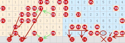 上图中22号数字是冷号。按照出号规律,每期都是要有3个左右的冷号的。这里我们可以防一下。上期说过24 25 26这个3连号是要落号,果然开出了26号数字。本期预测还是要落号的,26号数字上期已经落了,我们可以先排出。24号数字和前几期形成了对称类型,感觉还是比较好的。上图中32 33 34号这个3连号在上期没有落号,本期预测也是要落号的。34号数字与前两期35 36形成了3斜连,这里可以防一手。 36号数字和39号数字属于空2条类型 ,中间又是两个冷号,可以选一个做防守。