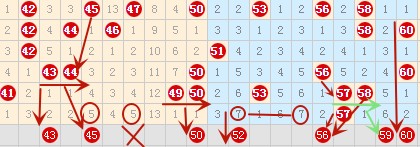 上期本区域开出了1个号码,又是一个大反弹现象。本期会回到正常情况开出4个以上号码。在上图中43 44号这个两连号同时有两期没落号了。本期可以选一个号防一手。45 47这两个号也是同时有5期没落号了,本期不落号,就要变成冷号了,这里可以定一个号。49 50号这个两连号上期没落号,预测本期是要落出一个号来的。这里可以定一胆。上图中52 55这两个号也是同时有7期没有落号了,本期可以选一个做防守。56号数字和前两期的57 58号数字形成了3斜连,在这里必须要防一下。60号数字近期是比较热的号码,所谓选号要冷热交替,所以这里可以防一下。