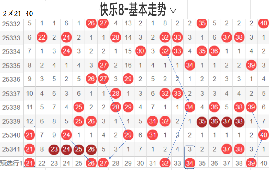 二区(21-40):遗漏5期以下有18,021 23 24 25 26 37 38  7,数据所示,冷码平均,选择条件增多了.上期开出了7个号码,出码比较分散.这期布防相应增加,重码按比例落这区较少,先给出关联码27,这个区间间接走势,温区,21-30区间上期开了5个,依旧不是重点选号区间,31-40区间开出2个,本期关注热码的回补,间隔小遗漏值最佳,3字头转热,这个小区热码注意回调,可以做关联码的布局,注重温冷码的回补.