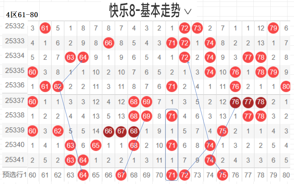 四区:(61-80):遗漏5(5)以下有16,063 64 74  3,平均温开方式,上期开出3,区间回暖,后区可防,区间从以往数据来看,重码很强,一枝独秀的存在,近期有回补走热的趋势,区间回暖,本区间后区可防,与一区相比,也是温区.,对称下落,隔期回补码,可以防,这区对呈对称三角关系的胆码,斜三连有走势的胆码,联动落位码,都有各自的走向落位关系,根据走势选择一种方式选码.