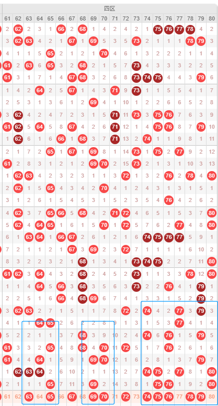 从近几期四区走势看,上期开了5码,四区依旧热门的,从近30期整体数据看,四区基本开5码以上居多,整体是大热门区域;从四区整体走势看,本期连号和重号都可以关注一下;其次再从冷热情况看,热号要重点关注,其次一些遗漏比较久的号码,防一下回补的可能性,比较看好的冷号有67-78;
