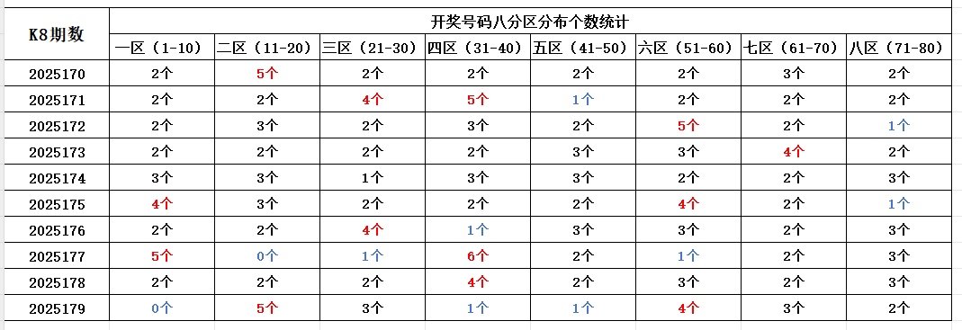 首先看上期回顾,“快乐8”第25179期开奖结果:11.12.13.14.16.21.22.25.40.45.51.55.56.58.65.67.69.72.76;通过分析开奖号码,分享第一个数据分析:统计开奖号码的八分区冷热走势,判断出号规律。上期开奖号码八分区走势较热的区间:二区、六区,区间号码开出4-5个;走势较冷的区间:四区、五区,区间号码开出1个;一区,遗漏未出。以近10期开奖号码的八分区统计数据为例: