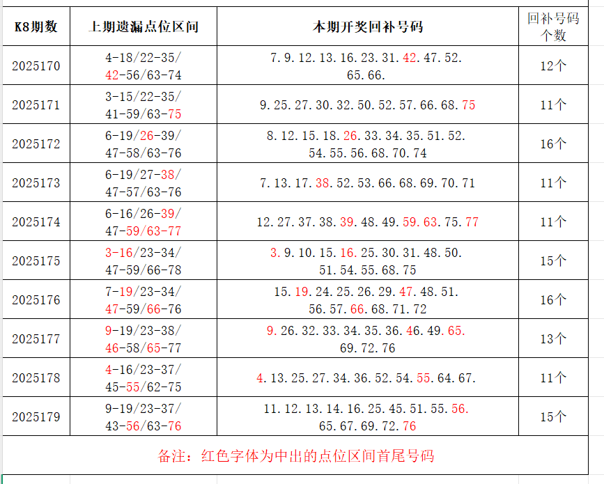 如图,上期的遗漏号码在下期开出10个左右,即为回补号码。定准点位区间首尾号码是关键!以上期2025179期(会员专区数据)为例,定位4个遗漏区间,围中15码!结合上期开奖号码,以跨度值大于或等于7为依据,本期关注3个遗漏区间:1-11/25-40/58-65;重点关注遗漏-区间:****(会员专区可见),区间遗漏号码可能在本期回补开出。注意区分遗漏区间回补号码和大底号码,不要混淆。个人分析,仅供参考。
