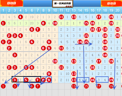 上图中1号数字和5 9号数字形成了大长三斜连,由于近6期开奖号中只有上期开出了1路号码得7号数字,所以本期的1路号码还是要有号码开出来的,1路号码有1 4 7号数字,应该会开出1个号码。再来看这种3 5 7号数字空一跳类型,这种类型的号码组合还是比较容易出夹号和出重号的,所以3 5 6号数字我们也是要关注的。再来看5 7 8 9这种连号空一带号的号码组合类型是最容易落重号下来的,这里的5 8 9号数字我们也是要关注的。所以1-10号数字区间我们可以重点关注1 3 6 7 8号这5个数字。在上期中开出了6个重号,所以本期预测应该是要出3重号的了,本期的13号数字我们也可以关注一下。14 15号这个两连号已经同时遗漏6期了,如果本期不出的话,那么下期我们就可以在这里选一胆码了,所以本期我们就先做一下防守吧。上期开出了19号数字,回顾历史期数中17 19 21号是经常一起开出或者是前后出的,所以本期的17 19 21号大概率会开出一个号码的。