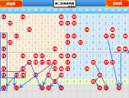 上图中的21号数字属于空一期出号趋势,它又和前面的19号数字关系密切,而且上期21 23 24号这种连号空一带号的类型组合没有落号下来,24号数字又是空一重号对称类型,所以本期我们可以在21 23 24号数字中选一胆码的。再来看25 26 27 28 29这个5连号在前几期中已经落了26 28 29号数字了,还有25 27号数字没有落下来,所以本期比较看好27号数字大概率会落号下来。28 30号数字以29号为中心对称,这种类型的号码组合也是容易落号的,还有就是它们的中心号我们也是要防守的,所以我们可以大胆的在28 29 30号数字中选一胆码的。冷号36号数字在上期没有开出来,那么本期它会不会回补呢?它又与35号数字为拐角对称,所以还是可以关注一下的。37 38号这个连号已经同时遗漏3期了,而且它们的邻号39 40号这个连号也是同时遗漏5期了,像这种两组连号在一起又同时遗漏很多期的情况下,预测本期在37 38 39 40号数字中是大概率要有号码开出来的。我们可以在这里选一胆码的。