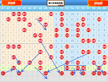 上期开出了43号数字,本期的41号数字我们就要关注一下了,回顾历史期数中41 43号数字大多数情况下都是前后出来的。不知道本期会不会开出来,可以期待一下。44号数字和43号数字形成了Z字型,这种类型的号码组合也是偶尔会开出来的,我们可以防守一下。52号这种落号情况和53号数字有点类似,都是重号空二出号的,而且52号数字又与48 50号数字形成了三斜连,所以可以关注一下。54号数字这个大冷号是53 55号数字的夹号,可以防守一下。再来看53 55 56号数字这种连号空一带号的类型组合,在前面分析中已经出过一组了。本期这种类型的号码组合一共有2组,有一组应该是要断号的。这里我们就选56号数字做一下防守吧。再来看58 60号数字是以59号数字为中心对称类型,这种类型的号码组合前面也是分析过一组了,但是这里我们也是要防一手的。像这种有两组的情况下,我们选一组对称的对角号,另一组就选它们的中心号,所以这里的58 59 60号数字我们也是可以选一胆码出来的。