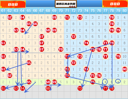 63 64号这个两连号已经同时遗漏了5期了,上期开出了它们的邻号65号数字,那么它是不是在为本期的63 64号数字落号做铺垫呢?所以本期的63 64号数字可以防守一下,看着有一定的落号概率的。上期开出的68 69号这个两连号预测本期应该是要落一个号码下来的,因为前一次出的68 69号这个两连号就没有落号了,所以本期我们就要出其不意,在这里可以选一胆码的。上期在71-80号数字区间只开了一个75号数字,我们首先就可以排出开75号数字开出的可能了。在上期中73 76 78 80号数字一个都没开出来,所以本期应该会有1-2个号码开出来吧。可以重点参考73 78号数字,73号数字和74 75号形成了3斜连,78号数字和71号数字形成了梯形组合,所以预出概率还是很大的。77 79号数字已经同时遗漏了4期,它们的中间又没有号码隔开,所以本期也是很看好会落一个下来的。好了,本期分析就到这里了。