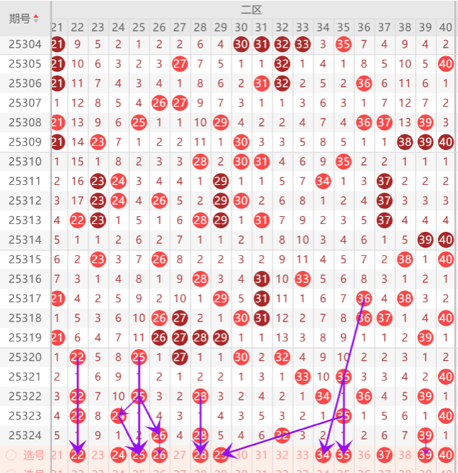 二区间注意参考的号22.23.25.26.28.29.31.32.37.39.40中关注4-5码开出机会。