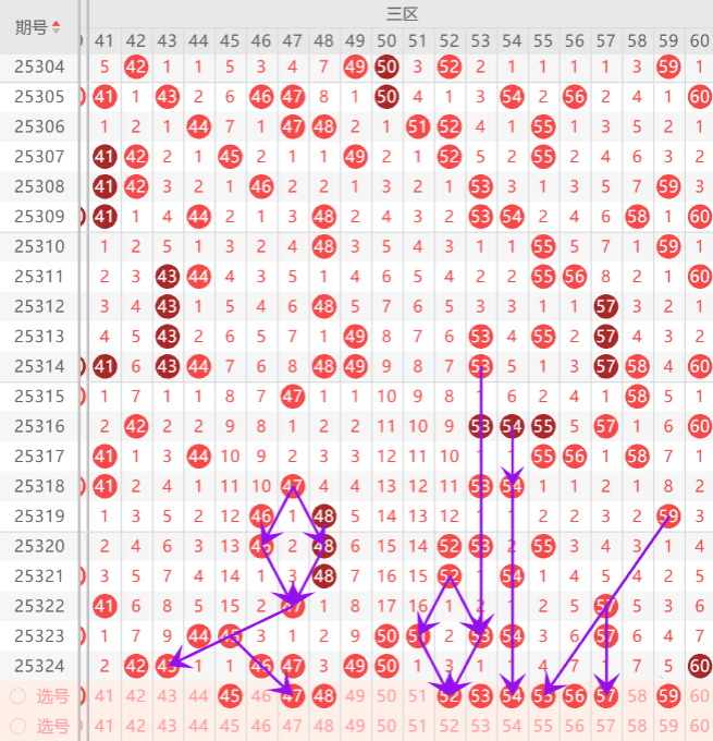 而三区的打底号是45.47.49.52.53.54.56.57.59中参考额3-4码开出机会,