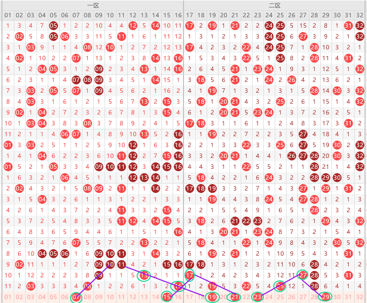 二区胆尾3尾5尾9尾,边号18 20 21 23 24 26 27 29出一码,重号19 22 25出一码,形态上19 21 23 29是斜连号,上图已勾画,缩小范围,隔5期号到出号周期了,本期20 23要出一码,近期2开头出重号,那么本期22 25出一码,8尾最热本期要防18,29昨天是金胆没出,出的同尾号19,本期29要跟一期不喜欢的不用关注,3开头今天要有一码,30 31 32出一,看好32,结论关注五码21 23 25 29 32防18