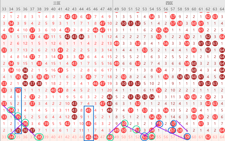 三区胆尾5尾6尾,边号34 35 36 37 38要出一码,重号35 36 37出一码,形态上34 38 48是斜连号,上图已勾画,其次5尾最热上图已勾画,35 45大概率二出一,6尾出二期,36不好出重号,看46,隔1期号出多期,本期39 42 45是隔一期号,39 45二出一,结论关注五码34 38 39 45 46防41