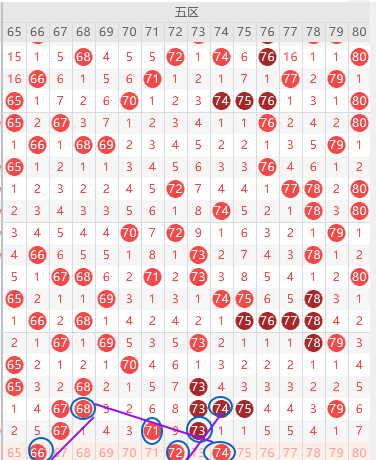 五区胆尾6尾7尾,边号66 68 70 72 74出1-2码,重号67 71 73出一码,形态上66 72 74是斜连号上图已勾画,缩小范围6开头走冷,7开头走热,那么本期6开头边号没断大概率66 68二出一,7开头边号看70 72二出一,喜欢冷号关注72,防78,结论关注五码66 68 70 72 78防65