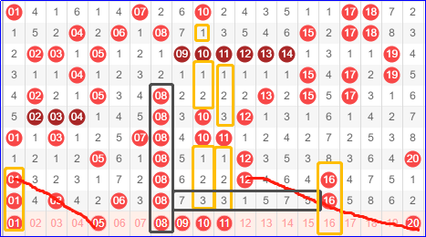 第一区间号码01-20,第一区间冷不算冷,热不算热,真的是煞费苦心啊。尤其是号码8,我估计很多人做的心惊胆战。想做不敢做,欲罢不能的那种感觉让人欲仙欲死。但是像这样的机会真的千载难逢,宁可错过不要放过。本期我们需要注意08与16之间的区域了,应该还有一波走势是必然的。