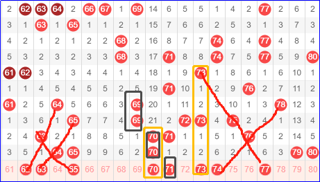 第四区间号码61-80,第四区间整体来说号码还是不错的,不过号码跨度比较大。这就导致中间遗漏的空白区域比较多,一旦猜不对区域,就会全盘皆输。尤其是前后各开出一个两连号的情况下,更加不明确297的方向在哪里了。但是依照我们平时研究的风格,我依然相信还是前半段更加看好一点。