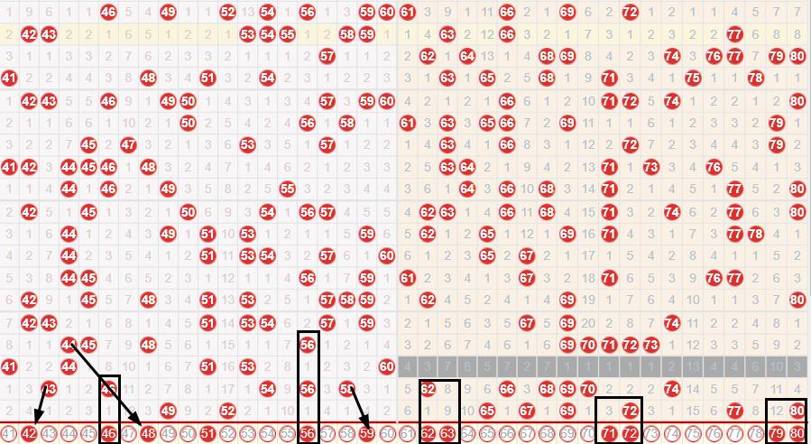 第四小区间61-80上期该区间开出6个号码,本期的走热的几率也是比较大的,这里的61 67的组合和62 67的组合参考下开出的几率是比较大的这里的63 64 65的组合防守下这里的70 77的组合和67 70的组合关注下开出的几率也是比较大的,这里的70 80的组合和70 79的组合关注下开出的几率也是比较大的本期的77 79的组合防守下回补的几率是比较大的本期的72 75的组合和72 80的组合参考下落号的几率也是比较大的本期的71 74的组合和71 77的组合参考下本期的71 80的组合和79 80的姐妹组合开出一组的几率也是比较大的这里比较看好71 80的组合的开出本期的79 80的姐妹组合关注下落号的几率也是比较大的这里的62 63的姐妹组合落号的几率也是比较大的