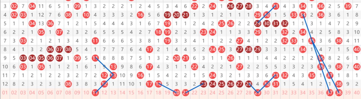 【第一区间1-40】上期开出13个号码。本期分析推荐:11-20-21-29-37-38六个号码。11斜连三期号码,同时1尾斜连;20偶数斜连号,20-21中间号码,为近期常见出号形态,同时21尾1尾斜连;29斜连三期、夹号,夹号近期较热;37-38斜连四期,对子在3头号段回补形态。区间推荐重点号码:一小区间11-20,二小区间21-37-38。