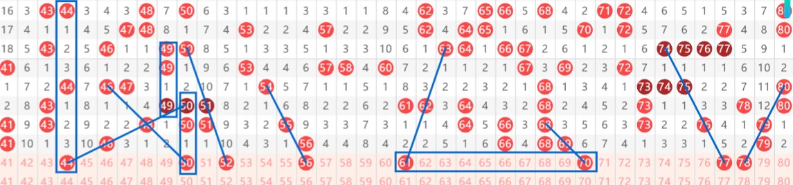 【第二区间41-80】:上期开出7个号码。本期推荐:44-50-52-56-61-70-77-78八个号码。44遗漏三期等距、偶数斜连号码,与上期26同形态;50偶数三斜连和二重遗漏一期号码,常见出号形态;52三斜连、大遗漏10期特别号码,需要防守;56斜连三期和重号来看待;61形斜连号码,同时与偶数四斜连号码70作为小区间首尾出号形态考虑;77-78除它们本身的斜连走势以外,同时从7、8尾号形态出号,与37-38形成顺位出号走势。区间推荐重点号码:三小区间44-56,四小区间61-77-78。