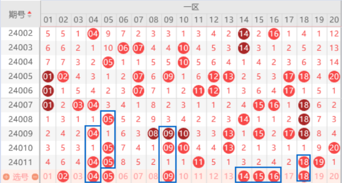 该区间的02号数字我们防守一下就行了,虽然走势很好,但是本期遗漏6期的号码只有1个,有点不好出。上期开出了04 05号数字,本期我们注意一下出重的情况。本期的09 10号数字我们要注意回补一个号码的情况,这里是有机会出一个号码的。本期我们注意一下14 16号数字同出的情况,还是有机会的。上期开出了18 19号数字的连号,本期我们注意一下走一个重号的情况。