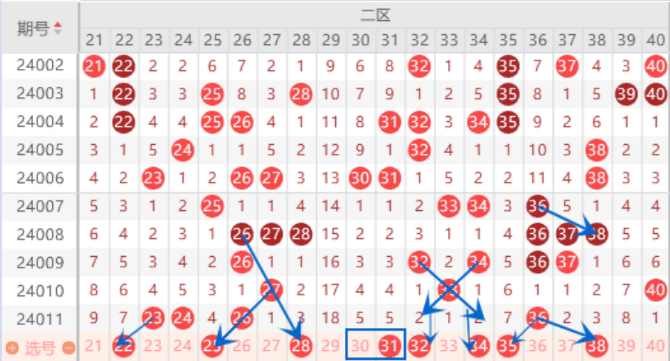 该区间的22 25 28号数字本期我们注意一下出一个号码的情况,他们是属于2路号码,已经遗漏3期没有出号了,本期应该是会出重号了,所以本期我们要重点关注一下。本期的32 34号数字是属于中心对称号码,本期我们防守一下回补号码的情况,如果本期不出,那么下一期依旧可以放弃了。本期的35号数字是属于遗漏7期的号码,本期遗漏7期的号码有4个,而且已经断号4期了,本期是要出号的,我们需要重点关注一下。