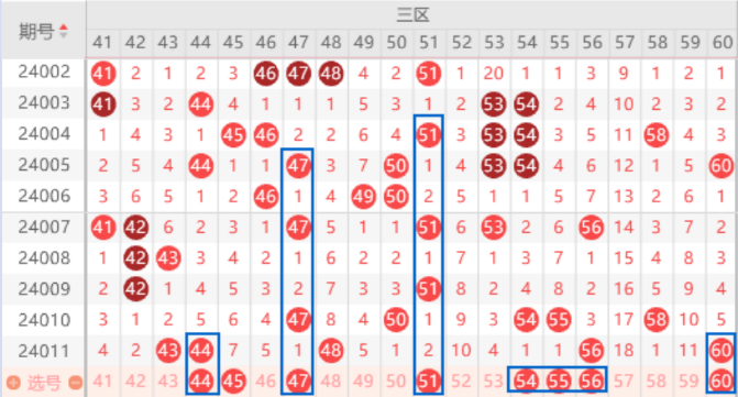 上期开出了43 44号数字的连号,本期我们注意一下走一个重号的情况。本期的47号数字是属于121走势,本期这种走势的号码有两个,本期我们要注意出一个号码的情况。本期的51号数字是属于212走势,本期这种走势的号码也是有两个,本期也是有机会出一个号码的,我们要重点注意。连号54 55号数字本期我们也是要注意回补一个号码的情况。