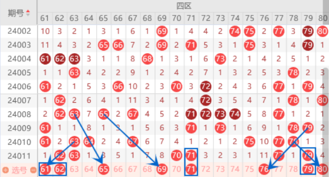 该区间上期开出了60 62 63号数字的连号空一带号,那么本期我们就要注意一下出一个重号的情况,夹号61号数字我们也是要注意一下的,属于复制号码,出号机会是很大的。本期的65号数字我们注意一下出号情况,属于三斜连号码,出号数字还是有的。本期的68 69号数字我们可以防守一下同出的情况。上期开出了70 71号数字的连号,本期我们注意一下出一个重号的情况。本期的76号数字我们注意一下,属于斜四连号,可以做一下防守的。上期开出了77 79号数字,那么本期我们注意一下有一个号码的走重的情况。