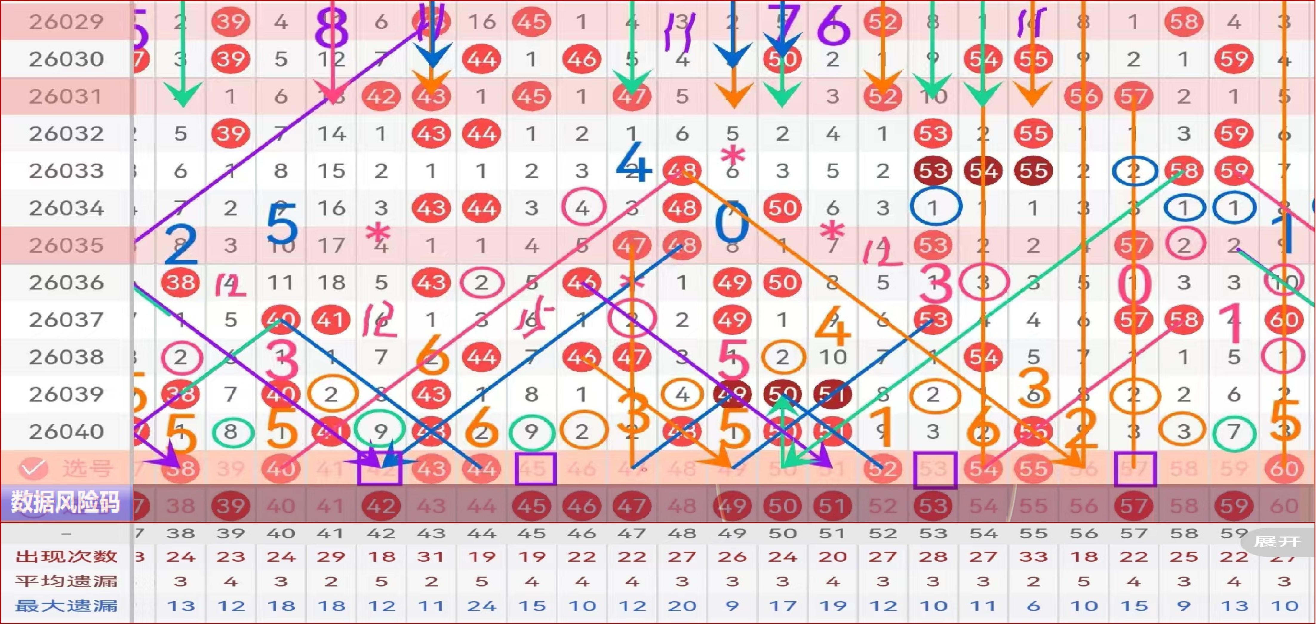 三区间上期出了6个号 码,热态开出;41有在数据,可小防;43三重本期推荐组重点关注,带上44的高遗漏属性码,做连号防守组合;区间中部建议放空,保留52高数据,正方形的边码,第二次走遗漏9点位,52可做防;孤码55本期同开走重,带上54做连号主防,二择一主做推荐55走重;56 小防;尾部60可主做,58小防;那么5字头这里注意52 55 58的同路带连做号形态52 54 55 58或52 55 56 58;
