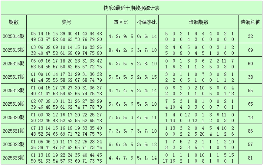 一、快乐8第2025324期奖号分析(定义:遗漏0-2期号码为热码,遗漏3-6期号码为温码,遗漏7期及7期以上号码为冷码,重码为上期开出奖号,邻码为上期没有出现,但与上期奖号差值为1的号码,例如上期开出奖号04,没有出现号码03和05,则本期03和05都为邻码,其它则为孤码。