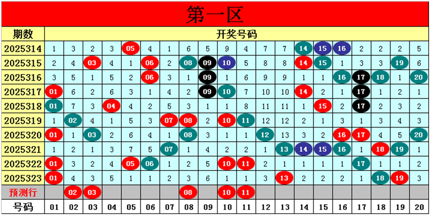 目前第一区包含13个热码:重码4个01、13、18、19,邻码2个14、17,孤码7个05、06、07、10、11、15、16;包含7个温码:邻码3个02、12、20,孤码4个03、04、08、09;包含0个冷码;号码冷温热个数比为0:7:13,重号、邻码、孤码个数比为4:5:11。