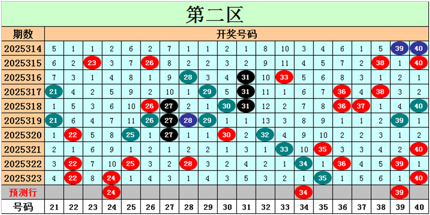 目前第二区包含10个热码:重码4个22、24、35、40,邻码4个25、34、36、39,孤码2个28、33;包含9个温码:邻码1个21,孤码8个26、27、29、30、31、32、37、38;包含1个冷码:邻码1个23,孤码0个;号码冷温热个数比为1:9:10,重号、邻码、孤码个数比为4:6:10。