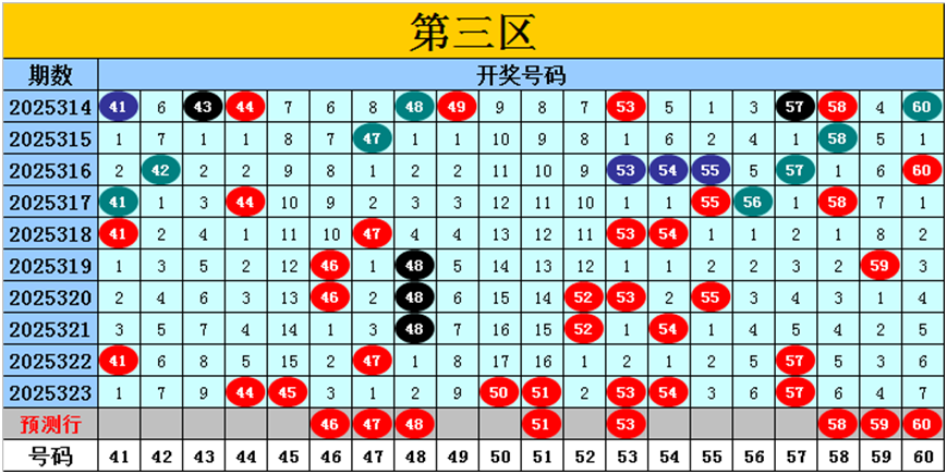 目前第三区包含11个热码:重码7个44、45、50、51、53、54、57,邻码2个41、52,孤码2个47、48;包含5个温码:邻码4个46、55、56、58,孤码1个59;包含4个冷码:邻码2个43、49,孤码2个42、60;号码冷温热个数比为4:5:11,重号、邻码、孤码个数比为7:8:5。