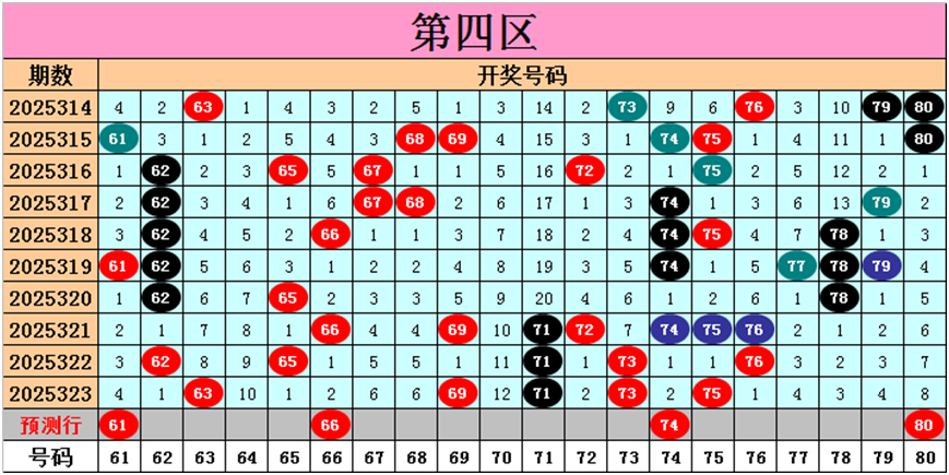 目前第四区包含11个热码:重码5个63、69、71、73、75,邻码4个62、72、74、76,孤码2个65、66;包含6个温码:邻码1个68,孤码5个61、67、77、78、79;包含3个冷码:邻码2个64、70,孤码1个80;号码冷温热个数比为3:6:11,重号、邻码、孤码个数比为5:7:8。