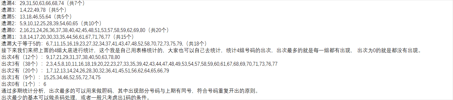 从上图看出,还是值得我们参考,经过统计精选了这些号码作为精选大底(2,3,8,10,12,17,20,21,24,26,30,33,35,36,38,42,44,45,51,53,54,56,57,59,62,65,67,69,71,77,80,),共31个,上期这个条件有29个,开出7个,所以可以用来作为我们进一步组号的一个条件。