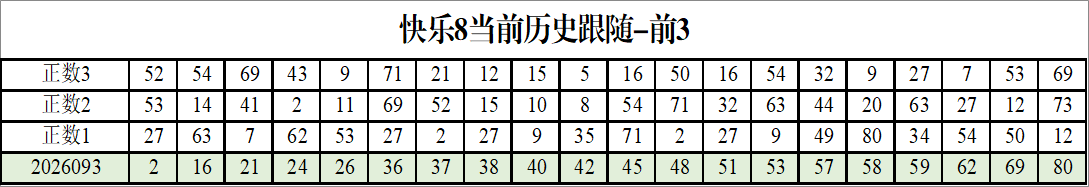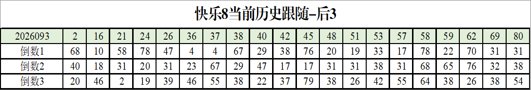 我感觉选热的同时,还要注意防冷条件开出,可以直接选取每个号码跟随出次前三的号码,也可以考虑把出次最后的三个数字加进去,不过这样可能号码太多,可以尝试。图上也能看出单独号码跟随的情况,我就不一一统计每个号码的出次了,我这里考虑提高概率,取每个号码历史跟随的前三号码和后三号码,根据2026093期的号码,我关注正数3和倒数3的号码号码为: