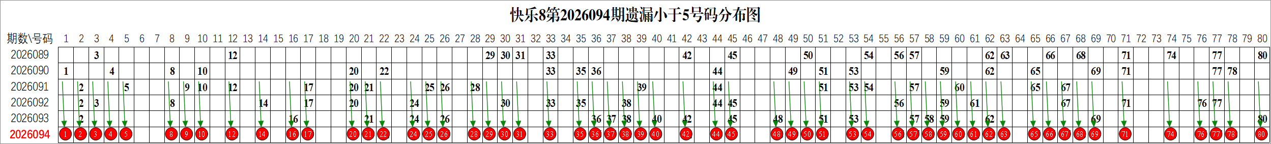 所以这个条件值得关注,从号码分布图上我们可以分析出,遗漏小于5期的号码有: