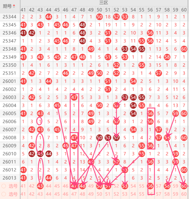 而三区的打底号是42.43.45.47.48.49.51.52.53.55.56.58.60中参考3-4码开出机会,