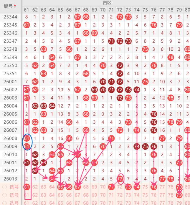 四区间的打底号是61.62.65.66.67.69.71.72.74.76.79中参考3-4码开出机会