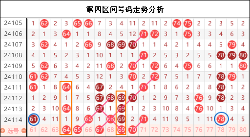 第四区间思路:四区预估失误,主线当中继续下拉,孤码走重之后并没有做延续走势。本期来看前后两大孤码,但形态上偏向于前半部分,遗憾的是前半部分龙头在本期当中与三区衔接成三连号,所以本期重点后半部分应该是目前最大的可能性,四区本期最大的亮点是本期当中出现三码冷号,且遗漏相同,那开出其中一码的可能性会更大一点,所以本期慎重选择。