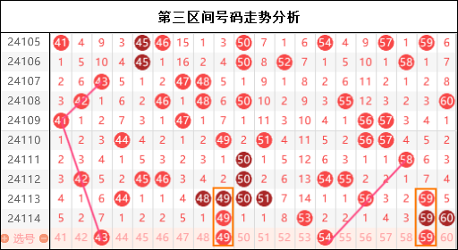 第三区间思路:三区前半部分断掉,后半部分出现孤码走重带连号的走势。那理论上来说,本期我们可以从前半部分整体入手去布局本期号码,但是目前来看重号比连号更加诱人,所以本期的走势当中我们应该是按照目前重号在独码当中出现的可能性最大去布局,然后再去补充前半段思路,这应该是本期最大的亮点。