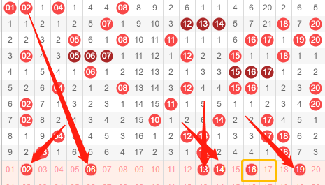 第一区间号码01-20,本区从表面看似乎要转入冷区,走势上也寥寥落落,不太喜人,重号方面考虑号码13,我们这一期没有标注号码18,是因为号码17和18紧邻,17没有走出三重号,而此时又赶上一区走势渐冷,所以号码18走下来的可能性就降低了。不过这个地方大家要注意一下黄色标注的区域,号码16和17这一期是需要重点关注的地方。