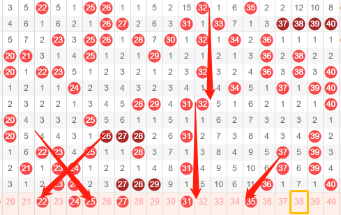 第二区间号码21-40,二区有点加速走热的步伐,尤其是23,34,27,28,29这里,下一期这里必然还会有号码出现,再就是号码31,是不是模仿号码32走出四期间隔的走势。这里还有一个号码可以适当关注一下,号码38.看起来36和40是分两边扩散走出,但这里唯独38是这个区间的中心号码。