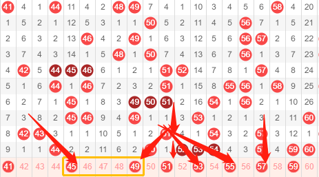 第三区间号码41-60,这一区间终于再一次起飞了,开出了八个号码,这一期根据走势的话预计会出现奇数间隔号码,每逢三连号和两连号出现必会走出一串间隔号,这也是过去开奖中曾经出现过的一些经验终结。剩下就是让人难以琢磨的43 44 45和49 50 51这地方,也就是我们黄色备注的地方,能不能走出我们期盼的补区情况。