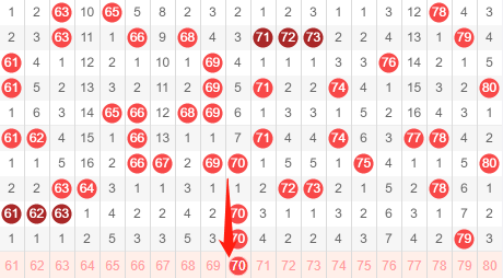 第四区间号码61-80,本期本区依然看好走冷,即使有号码,也无关联走势分析,所以本区有点老大难。但是64-70这一区间可以适当做一下参考。