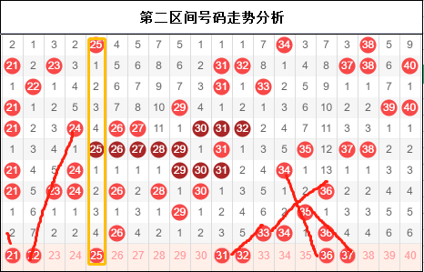 第一区间号码01-20,一区的15 16出现的比较及时,遗憾的是17没有出现,不然昨天又是一组快五。从整个走势上来看,昨天的开奖号码主攻路线为邻号。那在334期能否从主攻路线上走出斜连号的走势是这一期我们要考虑的问题。前期斜连号一直处于弱势,现下有这么好的机会,我个人觉得可以抓住这条线做一下。