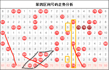 第四区间号码61-80,四区从昨晚的开奖号码来看,还是有一定机会的。但是你不用对本区做过多的奢望。因为对于这样的区间来说,我们暂时摸不透它的脾性。究竟是热起来,还是不温不火,究竟要开出什么样的号码,对于目前的区间分配来说。只能是观望一下再看。但是值得提醒的本区前半段这里标注的地方可以关注一下。